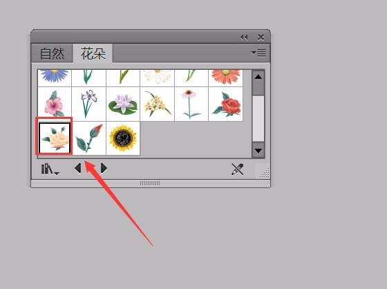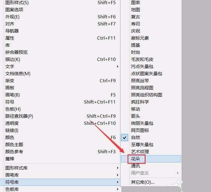 4、点击符号库选项在其子级菜单里我们找到花朵选项,如图所示: