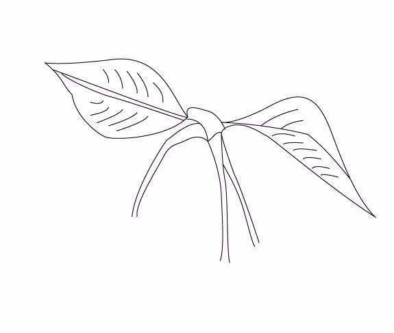 4、再在这两片叶子的再将使用钢笔工具绘制出樱桃的果把,如图所示: