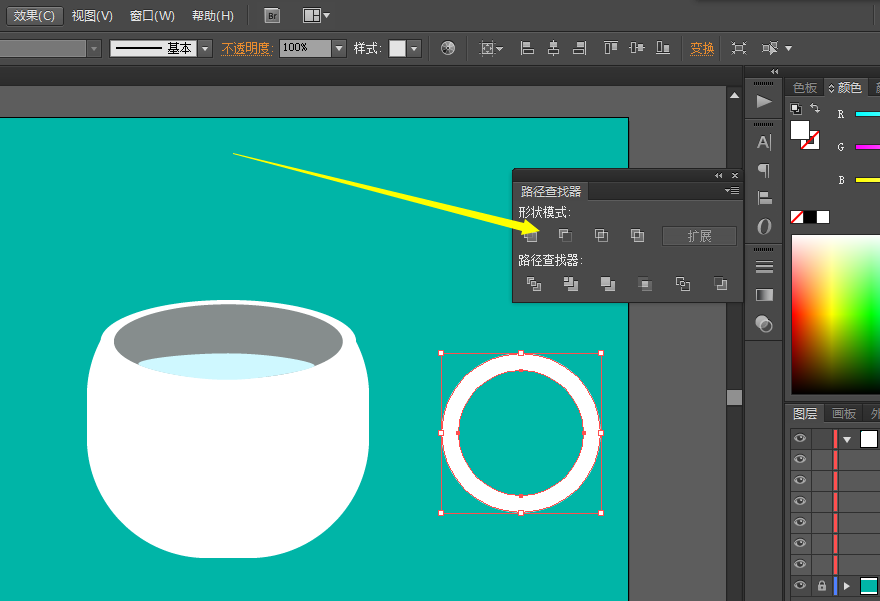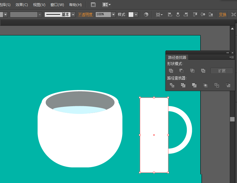 5、用椭圆工具在旁边绘制两个圆形,并且减去顶部,再绘制一个长方形,再减去顶部,得到杯子的耳朵。