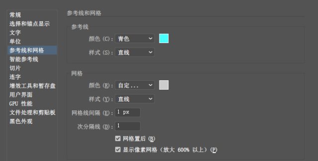 第一步:"常规"里的键盘增量设置为1px,"参考线和网格"里的最后两项都设置为1,如图。