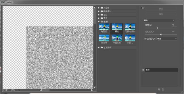 复制该矩形(选中矩形,Ctrl+C复制,再Ctrl+F粘贴到上层),将复制出的矩形的颜色更改为#808080。然后,在顶部菜单栏找到"效果",点击"纹理",选择"颗粒",在弹出框中,设置强度为40,对比度50,颗粒类型为喷洒。