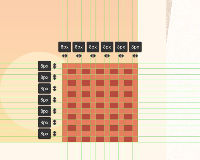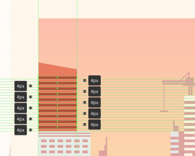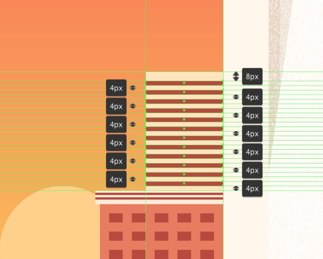 创建一个96x16px的矩形(#FFEDD7)作为建筑物的上半部分,在其上我们将添加三个96x2px的矩形(#BA473C),它们彼此垂直堆叠2px。打组,并将形状定位在下半身的顶部,之后对整个建筑物进行相同的操作。