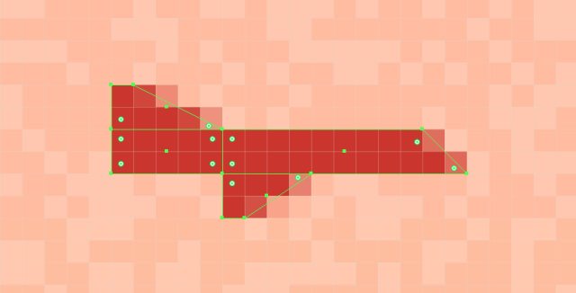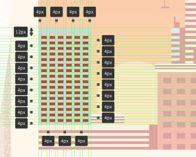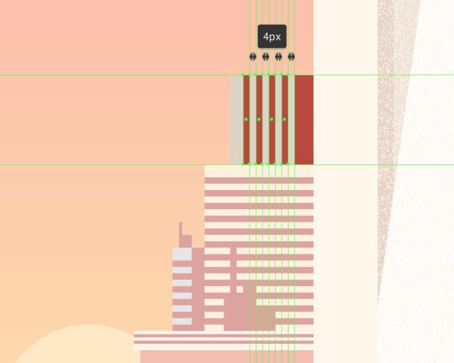 使用七行五个12x8px矩形(#BA473C)添加窗口,将它们沿水平和垂直方向彼此隔开8 px。然后将它们编组(Ctrl+G)并将它们放置在建筑物中,如图。