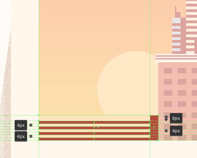 创建112x12px的矩形(#FFEDD7)作为屋顶,在其上添加两个112x2px的水平细节线(#BA473C),垂直堆叠2 px,并且从较大形状的顶部边缘垂直堆叠。将所有三种形状编组,将它们放置在当前建筑物的顶部。