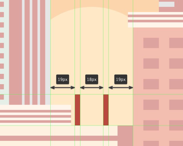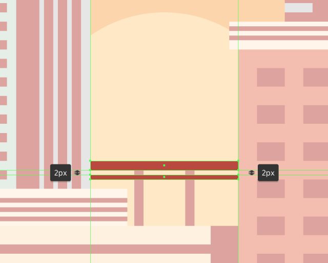 首先创建桥墩,使用两个4x24px的矩形,颜色#BA473C,水平间隔18px,打组,然后将它们放置在城市中心,如图所示。