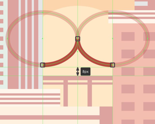 创建2个64x48px的椭圆,颜色#BA473C,由填充变为描边,描边大小为4px,椭圆相切,距离桥身8px。选择"直接选择工具",选中不要的锚点,delete删除。最后Ctrl+J连接中间那个锚点(如果这一步你不能理解,那你可以直接打组)。