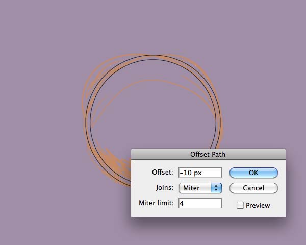 步骤4、选择该圆圈并应用偏移路径选项(对象>路径>偏移路径)和-10 px偏移值。有了这个,我们得到一个比我们原来的圆小一圈的圆(你也可以通过复制它并缩放它来做到这一点)。