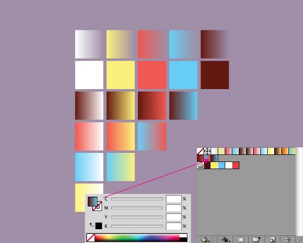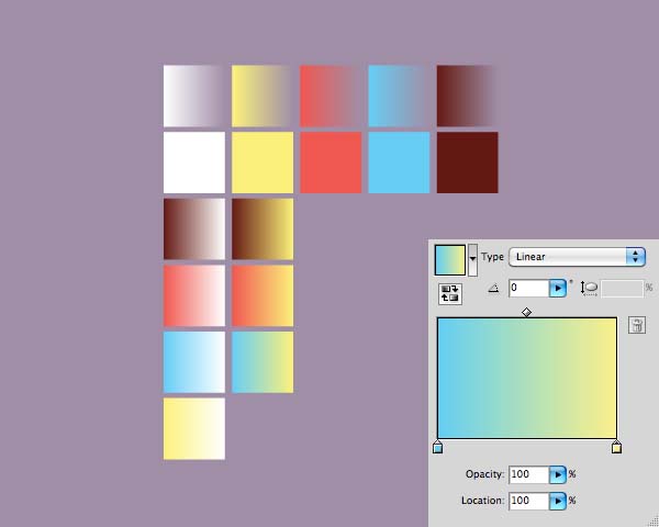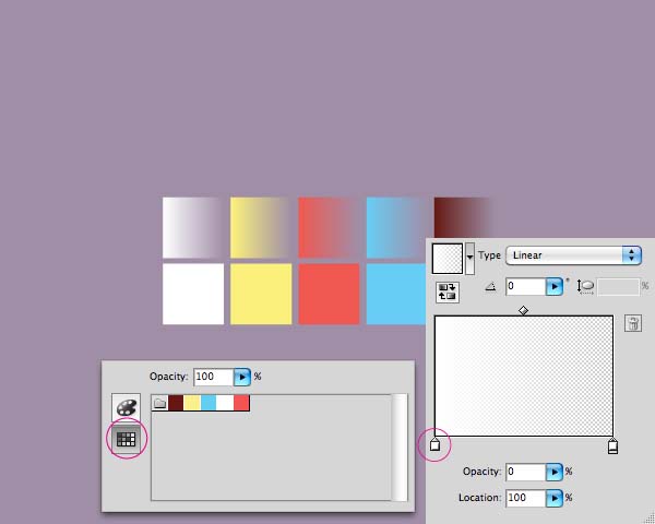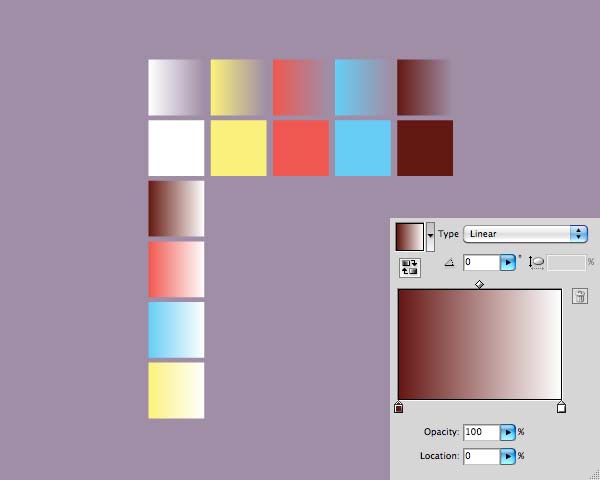 第9步、现在,我们从添加梯度每种颜色的,第一不透明度的100%至0%为每一个。要在渐变窗口中更改颜色,只需双击颜色,即可获得"色板"面板,然后在其中更改颜色。