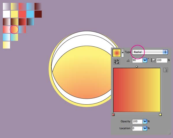 第12步、现在应用红色和黄色渐变;但是,在"渐变"面板中,我们将选择"径向"而不是"线性"。这将是我们在径向模式中使用的唯一渐变。