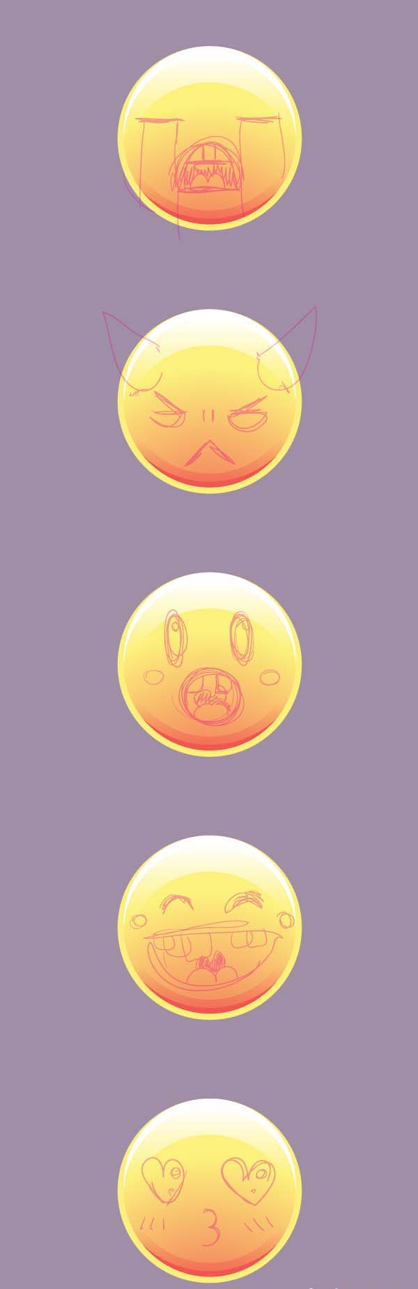 步骤1、我们将五个基本形状的圆圈复制到表情符号和我们的"脸部素描"图层中。我们通过使用Blob画笔工具(Shift-B)绘制草图 - 悲伤,生气,惊讶,快乐和爱情表情 -。我们将不透明度设置为40%以更容易重绘,锁定此图层,然后我们开始在"Faces"图层中重绘。