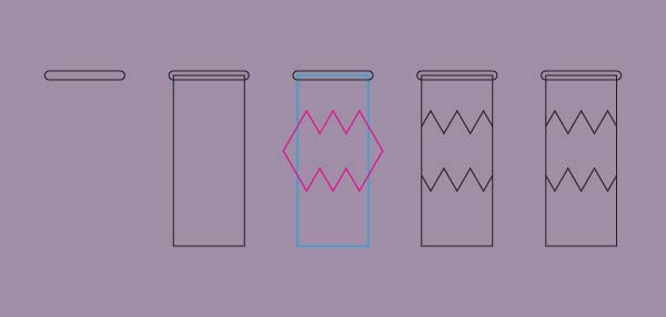 添加一些矩形以获取更多细节。先画一个然后复制它。要做到这一点,请选择它,然后按住Alt键并拖动它以获得矩形图的副本。然后按Command-D完成最后一步,并以相同的距离得到它的副本。然后选择三个。在Pathfinder面板中应用Unite,最后在Pathfinder面板中应用与牙齿形状相交(记得复制您的基本形状)。