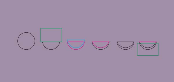 第5步、要添加更多的细节到嘴巴,你可以画一个圆形的喉咙为基地,并结合长方形和圆形的悬雍垂。在Pathfinder中应用Unite,按照您在图像中看到的方式选择节点(绿色虚线),然后在工具栏中将它们转换为圆形以获得更平滑的外观。最后应用Minus Front。