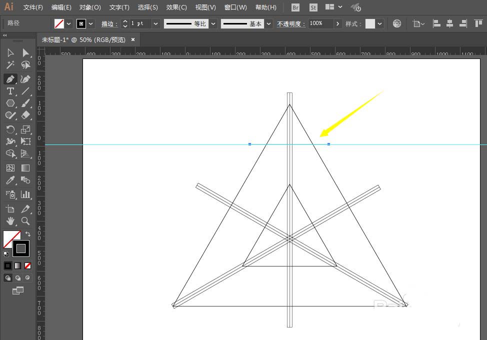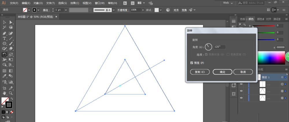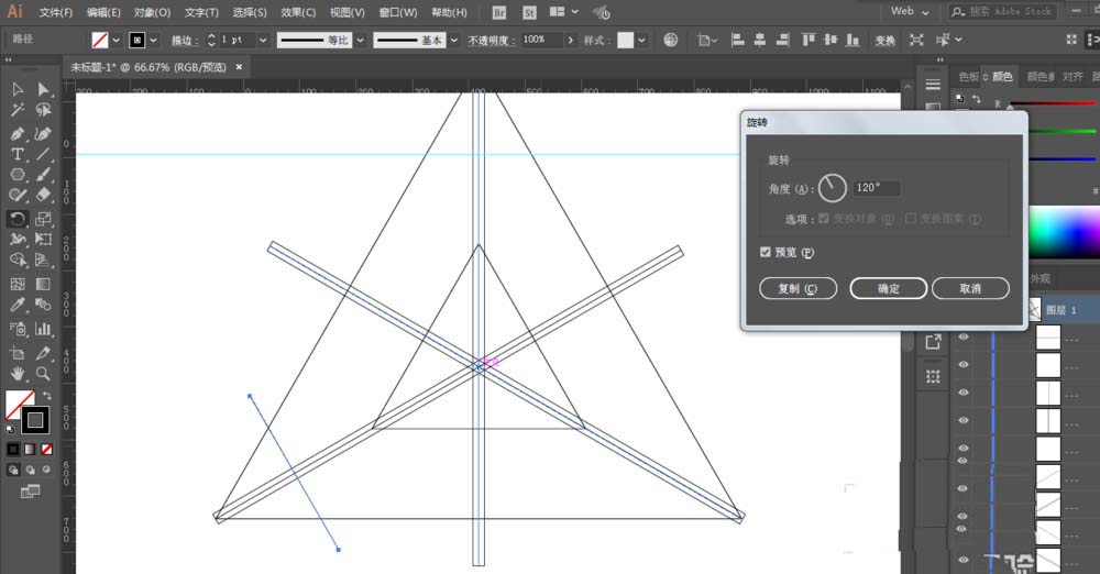 2、用钢笔工具绘制直线,然后进行120度旋转,再绘制直线,再次120度旋转。再重复以上步骤一次。
