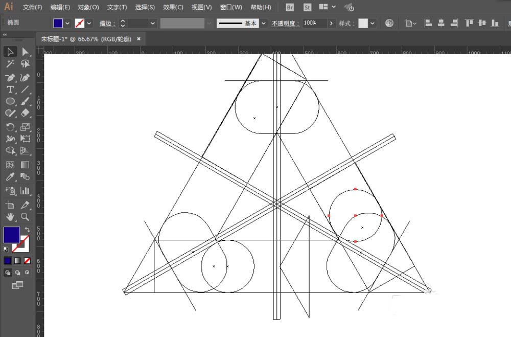 6、绘制三个圆形,并且用直接选择工具删除不要的锚点得到半圆,然后连接4个锚点。复制旋转120度,再重复步骤。