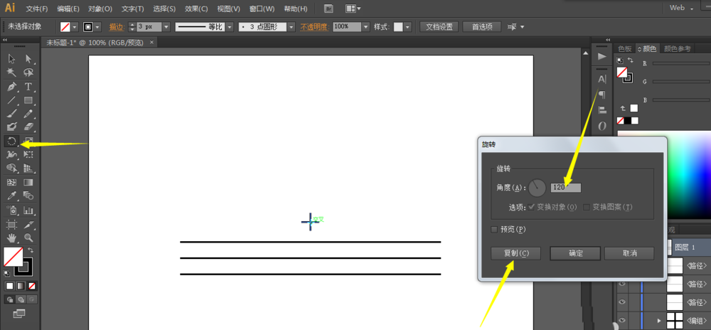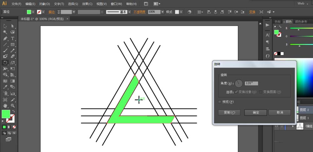 3、进行复制旋转120度,再进行一次,就得到一个三角形参考线了。
