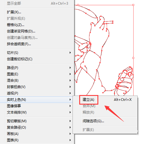 8、绘制好人物图形之后在菜单里找到对象选项,点击对象我们在其内找到实时上色选项,点击该选项在其下拉菜单那里找到建立选项,如图所示: