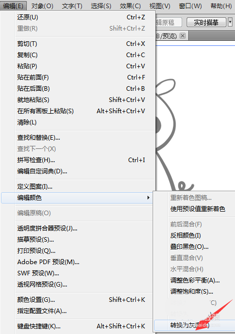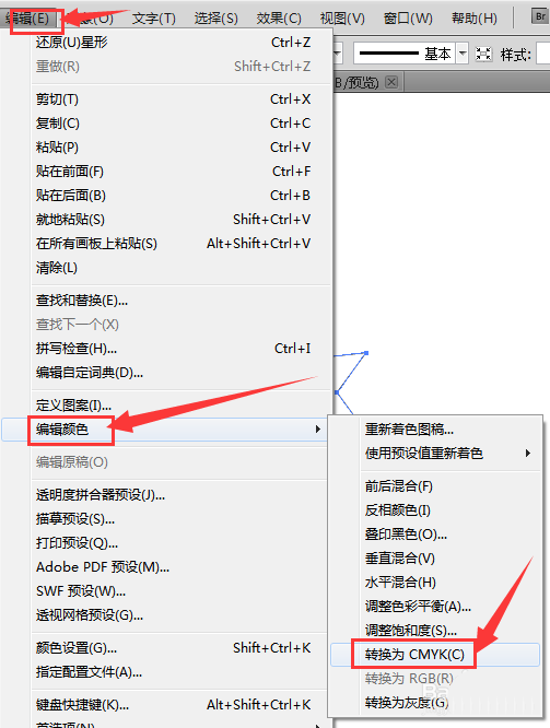 3、AI另外一种颜色模式CMYK,打开编辑--编辑颜色--转换为CMYK,就可以转换颜色模式。点击色板右上角的小三角,可以转换其它的颜色模式的色板模式。