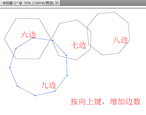 8、拖动鼠标不放,加按向上键,即有向上箭头的那个键,每按一下,多边形多增加一条边。