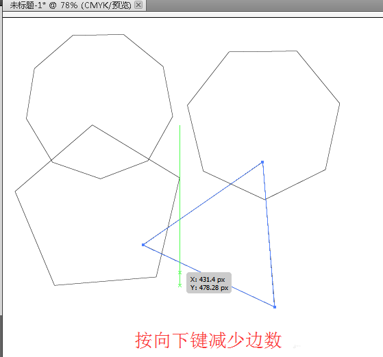 9、拖动鼠标不放,加按向下键,即有向下箭头的那个键,每按一下,多边形减少一条边。