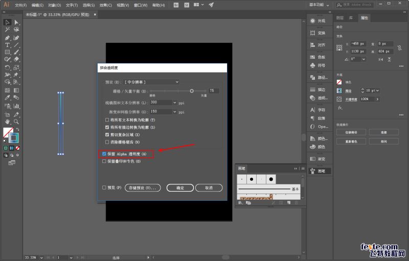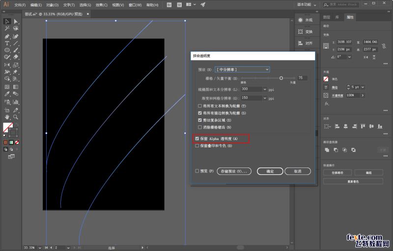 同样选中三条线段以后,执行对象-拼合透明度,同时勾选保留Alpha透明度: