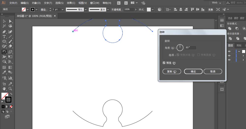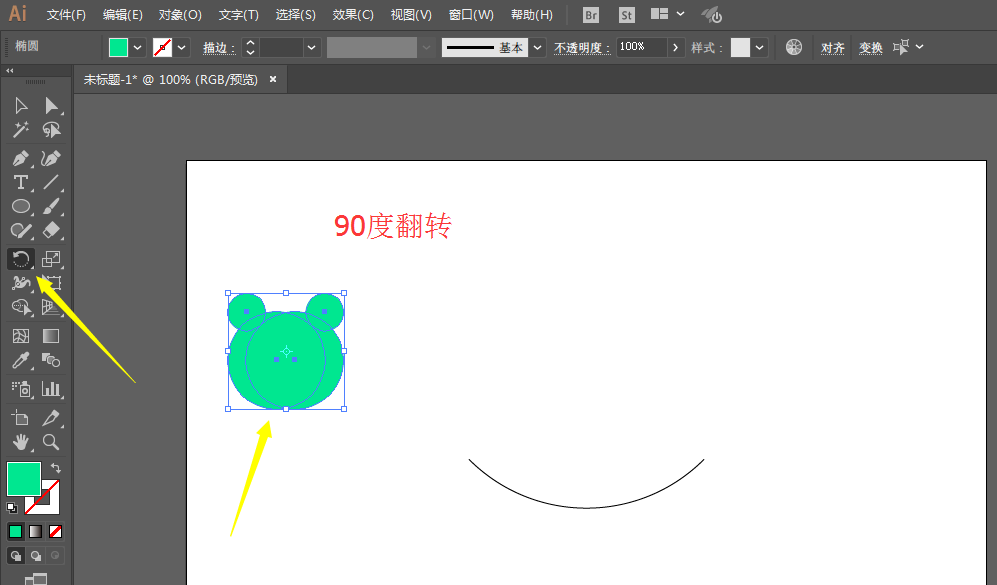 2、用椭圆工具绘制两个圆形,并且调整方向。然后90度翻转和垂直翻转。