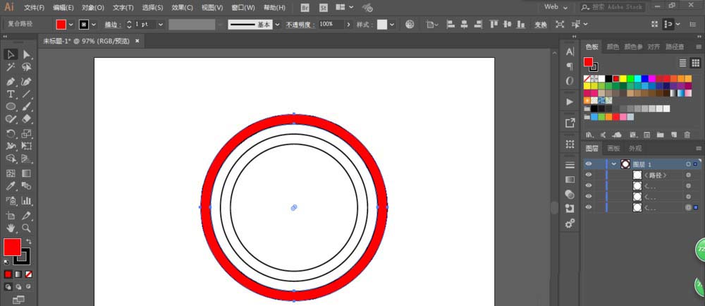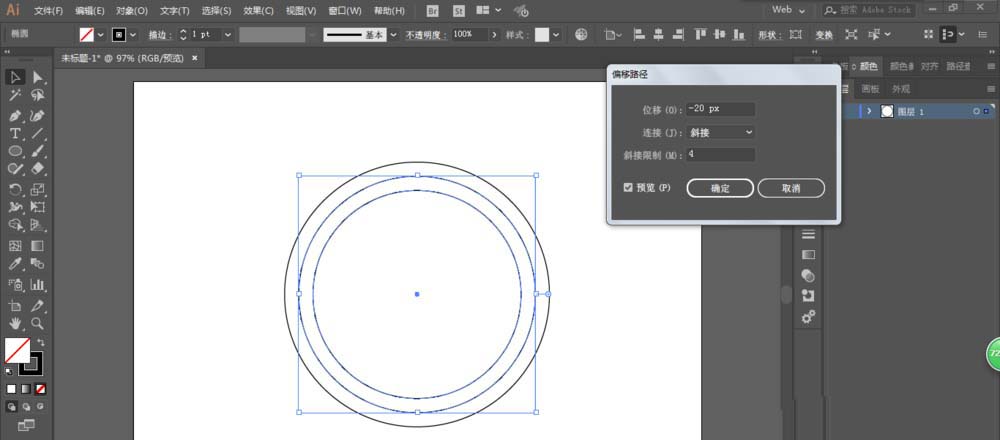 2、用椭圆工具绘制一个圆形,然后进行偏移路径。继续进行两次同样的处理。
