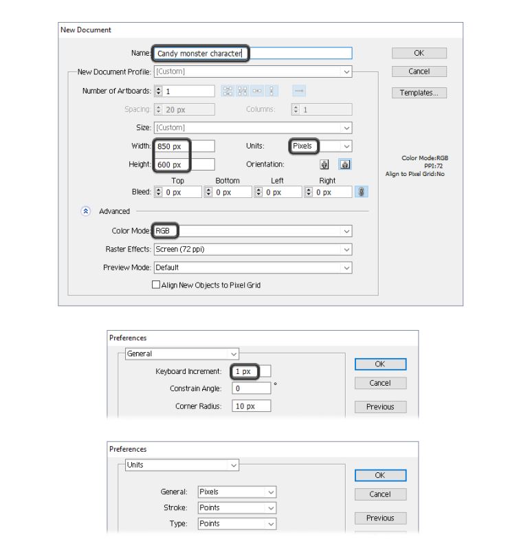 启动Illustrator并转到文件>新建以打开空白文档。为文件输入名称,设置尺寸,然后选择像素作为单位,选择RGB作为颜色模式。确保未将新对象对齐到像素网格。