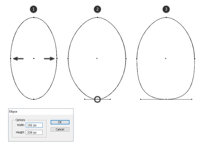 取椭圆工具(L)并在美工板(1)上绘制一个192 x 339像素的椭圆。切换到直接选择工具(A)并使用它仅选择右侧和左侧点;然后将它们向外移动以制作椭圆形圆形(2)。现在,只选择底点并拖动手柄使其变长(3)。