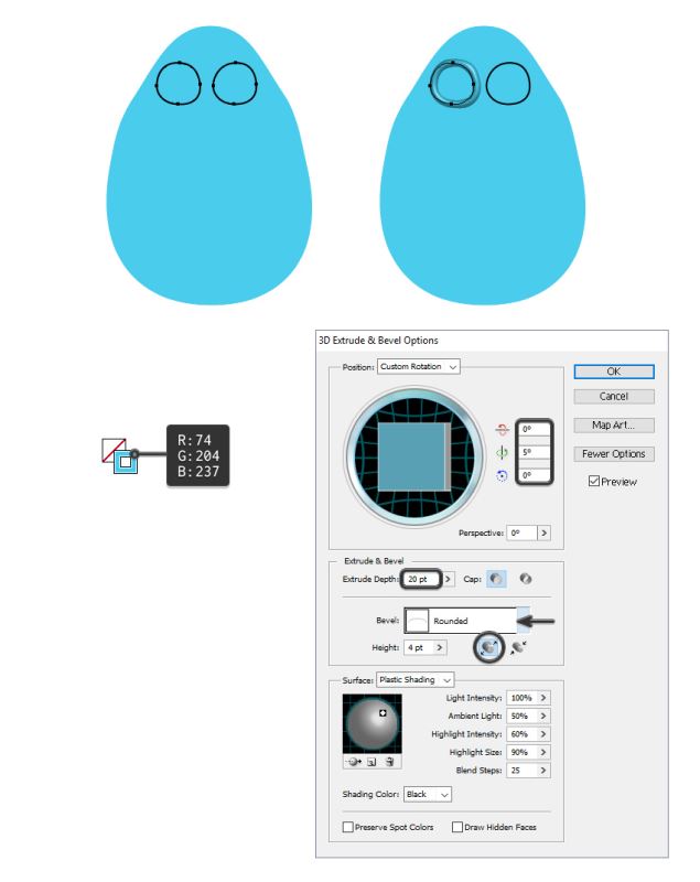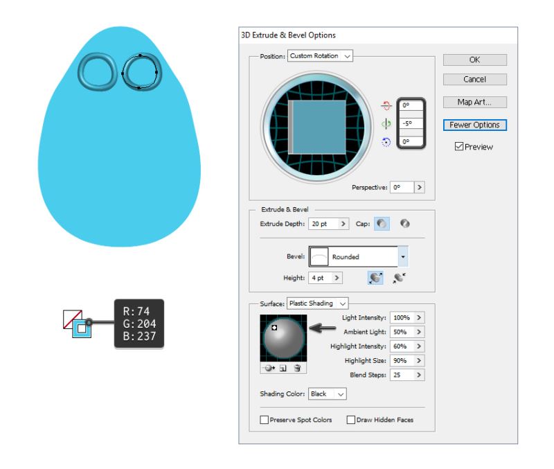 选择右眼并再次转到效果> 3D>挤出和斜角。除了旋转坐标和光线之外,您必须从右上侧(默认)移动到左上侧,这些设置是相同的。