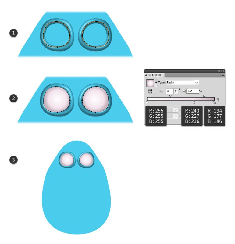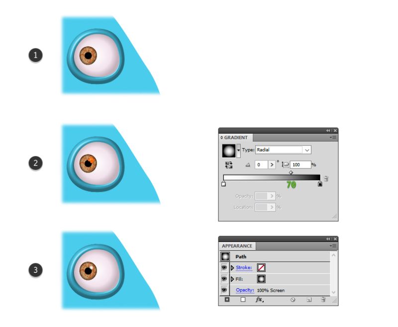 放大眼睛,在3D轮廓内画出眼球,确保不遮盖由3D效果创建的阴影和高光(1)。按照(2)所示的径向渐变填充眼球形状,您可以在下面的图像(3)中看到结果。