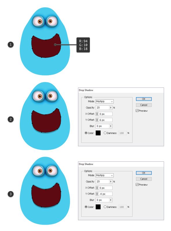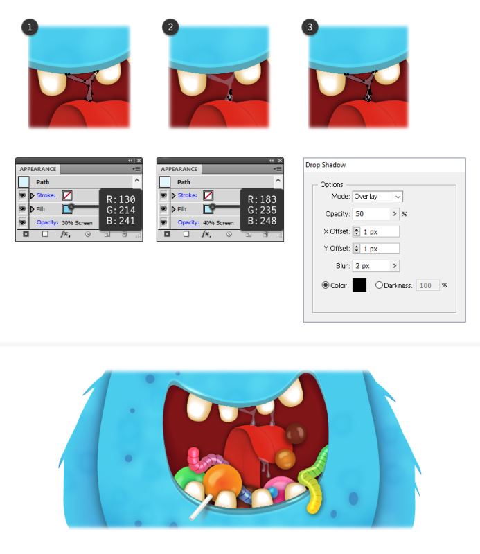 拿起钢笔工具(P),为所有的糖果绘制一个大嘴巴的形状,并用深红酒红色填充(1)。在选中此形状后,转至效果>风格化>阴影效果,并应用显示的设置(2)以获得蓝色的下唇。再次应用阴影效果,使用显示的其他设置(3)获取上唇。