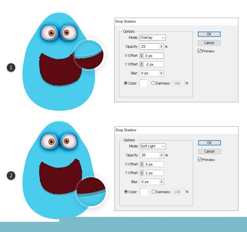 现在,选择右眼轮廓并应用两个阴影效果。这些设置与上述相同,但X偏移量(这次为负值)除外。