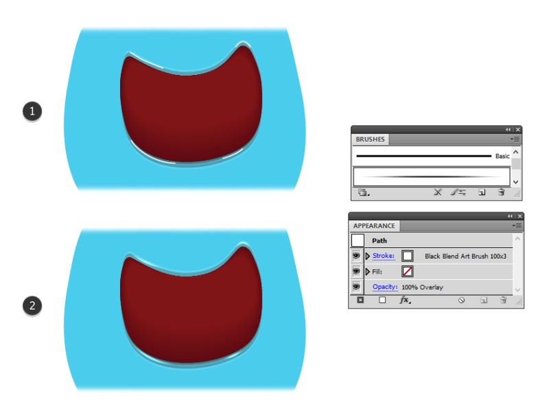 接下来,拿起钢笔工具(P)并在嘴唇上绘制四条路径(1)。给他们1磅白色笔触,并使用黑色混合艺术画笔100x3(下面的信息)。将所有四个(2)的混合模式设置为覆盖。