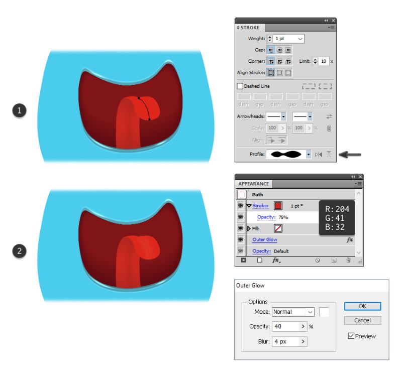 通过后件的中间画出一条路径,并将其移动到舌头的前段(1)后面。使用指定的颜色给它1 pt的描边,并在"描边"面板中选择"宽度配置文件2"。