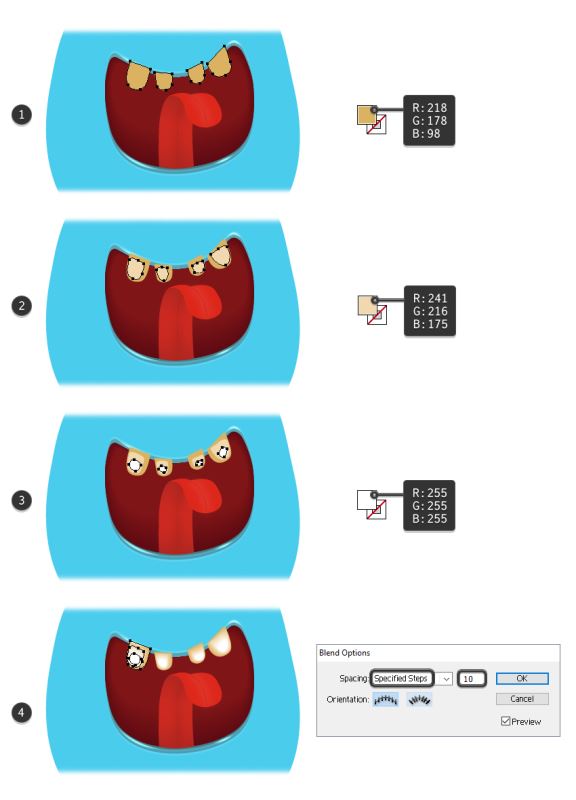 现在,选择组成第一颗牙齿的三个形状,然后转到"对象">"混合">"混合选项"。选择10个指定步骤并点击确定,然后返回到对象>混合>制作(Alt-Control-B)。对另外三颗牙齿重复同样的操作(4)。