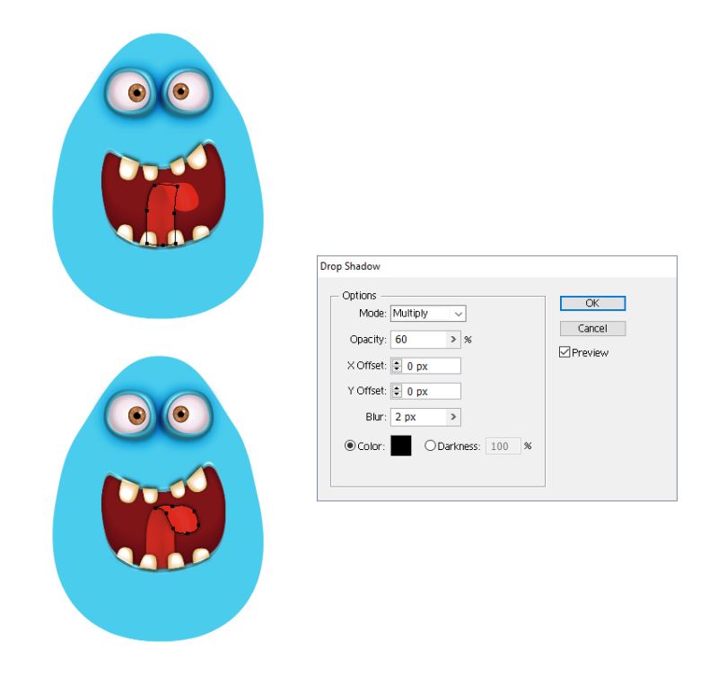 选择舌头的两个部分并使用所示设置应用阴影效果。