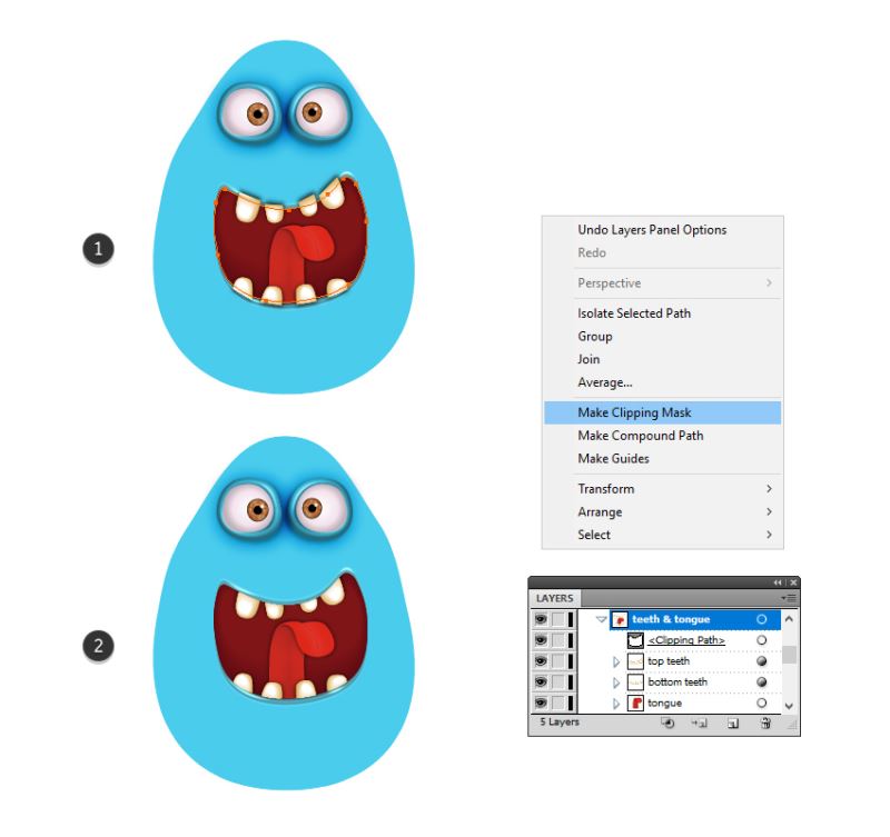 现在,选择嘴巴,上下牙齿和舌头的这个副本,然后进入对象>剪贴蒙版>制作(Control-7)。您可以在下面的图像中看到结果(2)。