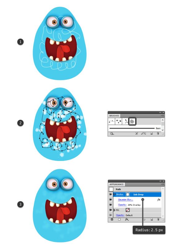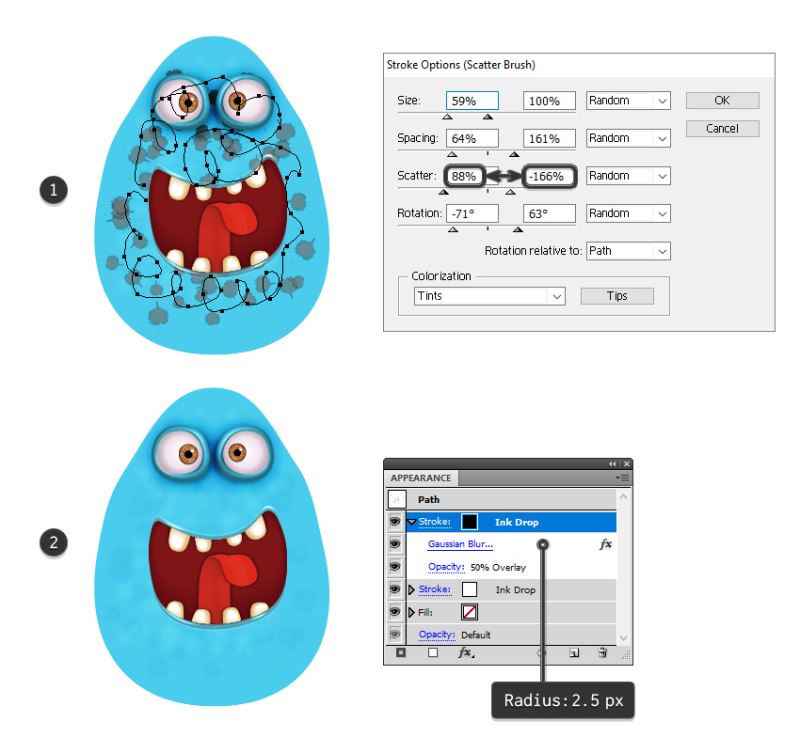 抓住铅笔工具(N)并在怪物的身体上绘制一条随机路径,然后将其发送到眼睛和嘴后(1)。使用Brush Libraries菜单>艺术> Artistic_Ink(2)中的Ink Drop Scatter Brush,给它1 pt的白色笔触。