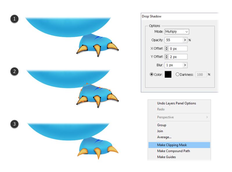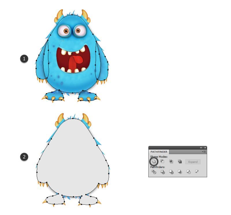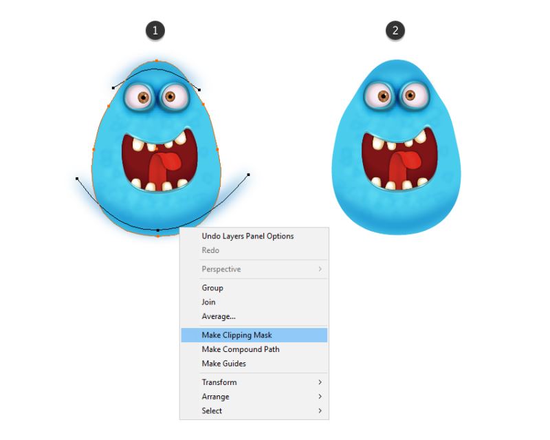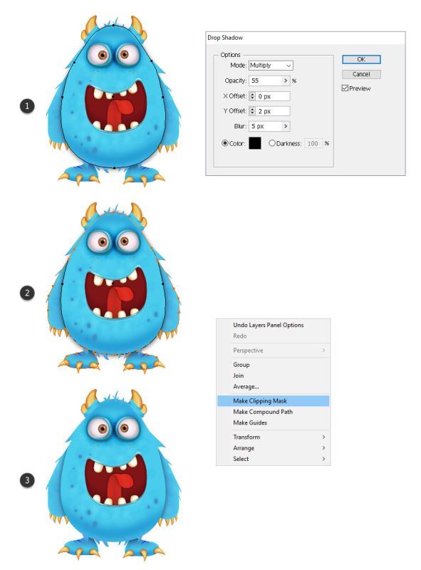 选择您在上一步中获得的形状,将其设置为"无笔画"和"无填充",然后将其移动到"图层"面板正文的正面。现在,选择与此形状一起的物体,然后转到对象>剪裁蒙版>制作(Control-7)(2)。因此,落在白色背景上的怪物周围的阴影将不可见(3)。
