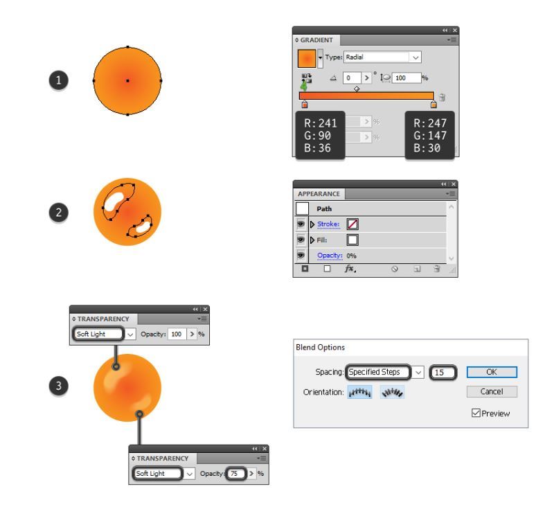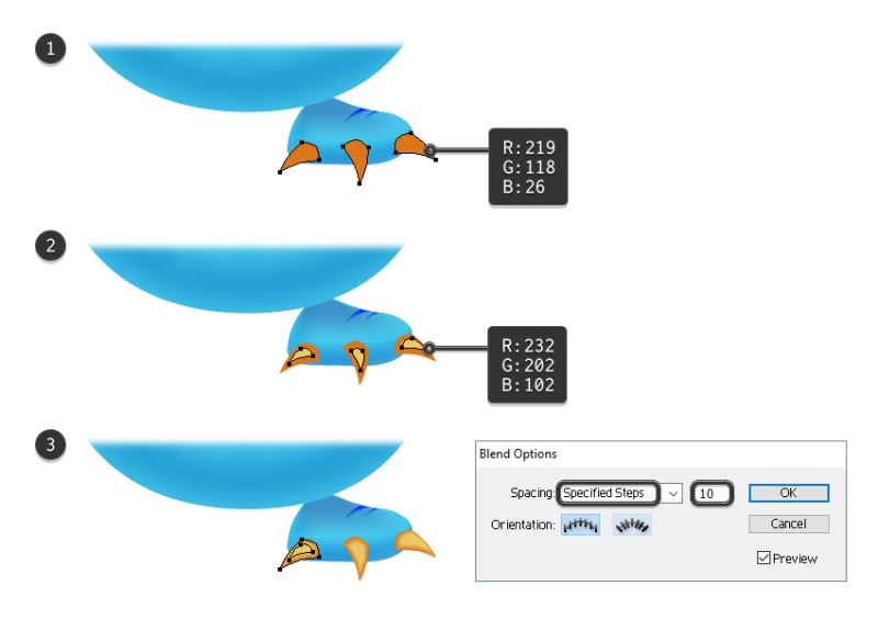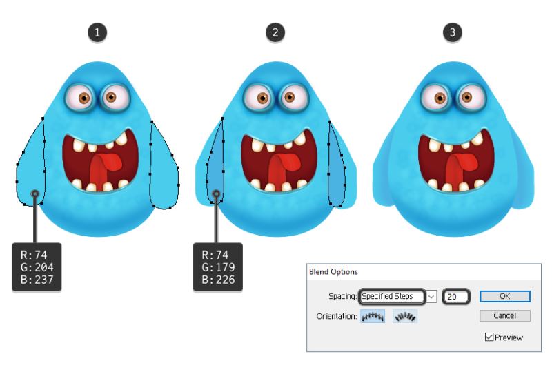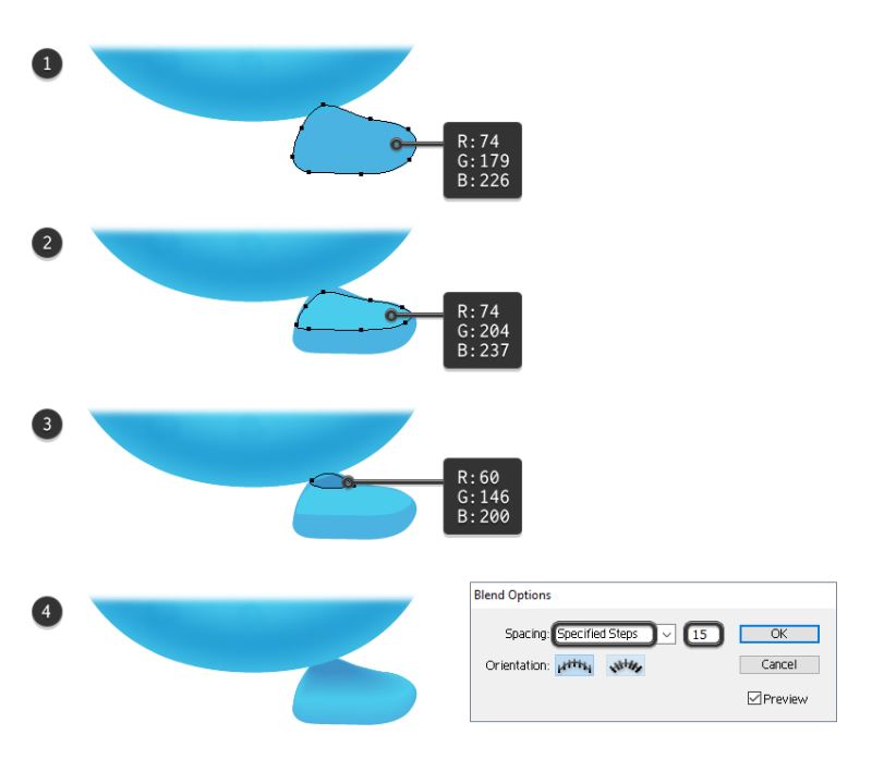 现在,选择两种形状并转到对象>混合>混合选项。选择20个指定的步骤,点击确定,然后返回到对象>混合>制作(Alt-Control-B)(3)。
