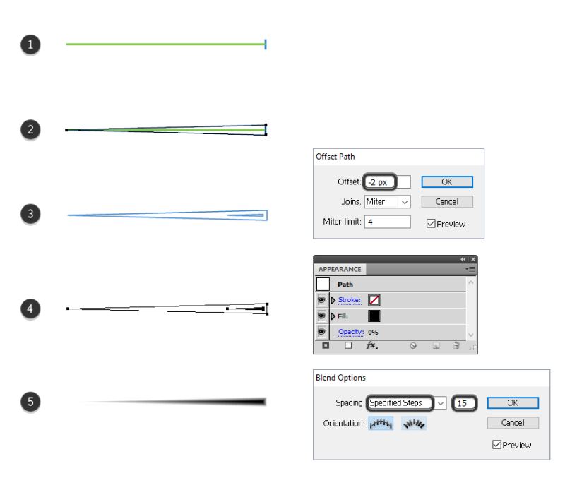 使用这两条线作为指南并绘制一个尖锐的三角形(2)。当这个三角形保持选中状态时,转到对象>路径>偏移路径,并应用-2 px的偏移量以获得内部较小的偏移量(3)。