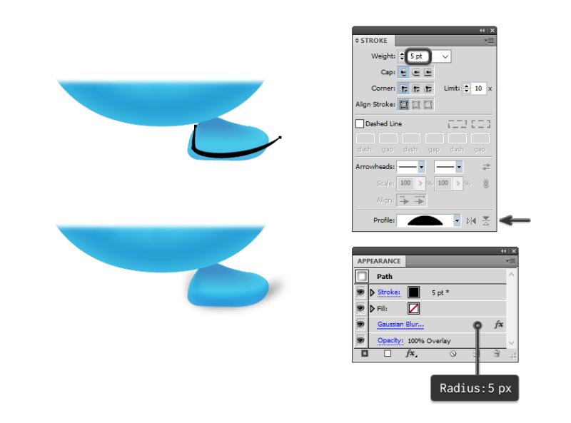 使用钢笔工具(P)在脚底绘制一条路径,并使用黑色和宽度配置文件6为其指定5点行程。应用5 px高斯模糊并将混合模式设置为覆盖。