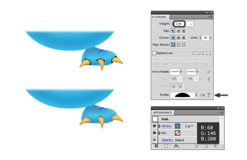 按照爪的顶部边缘,用钢笔工具(P)绘制三条路径。给他们一个2点行程并使用宽度配置文件6。将这些路径发送到"层"面板中的爪子后面。