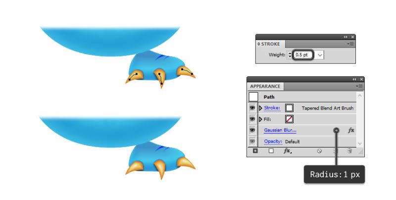 虽然笔画属性保持在所选择外观面板,去影响>模糊>高斯模糊,并应用半径的2.5像素。将混合模式设置为覆盖并将不透明度降低至20%(3)。