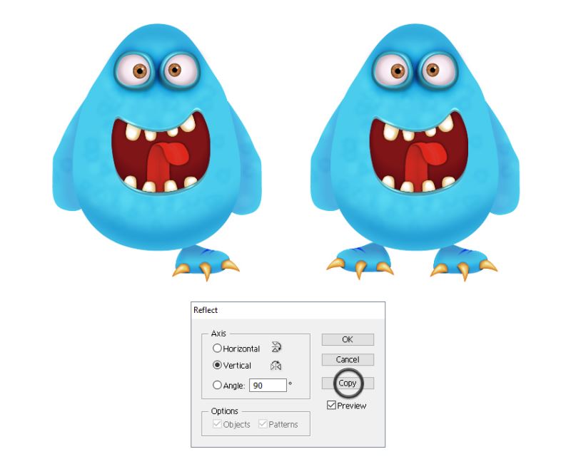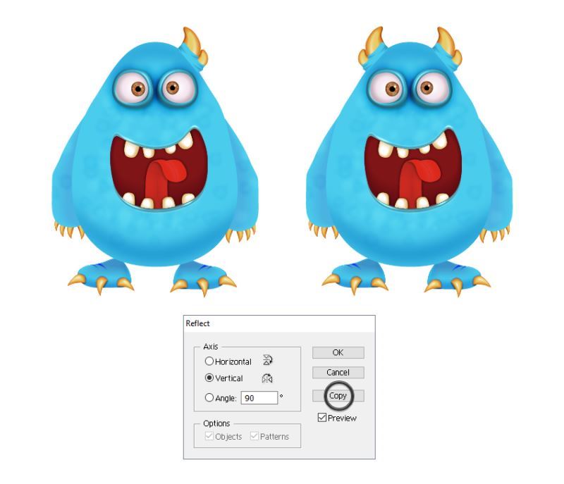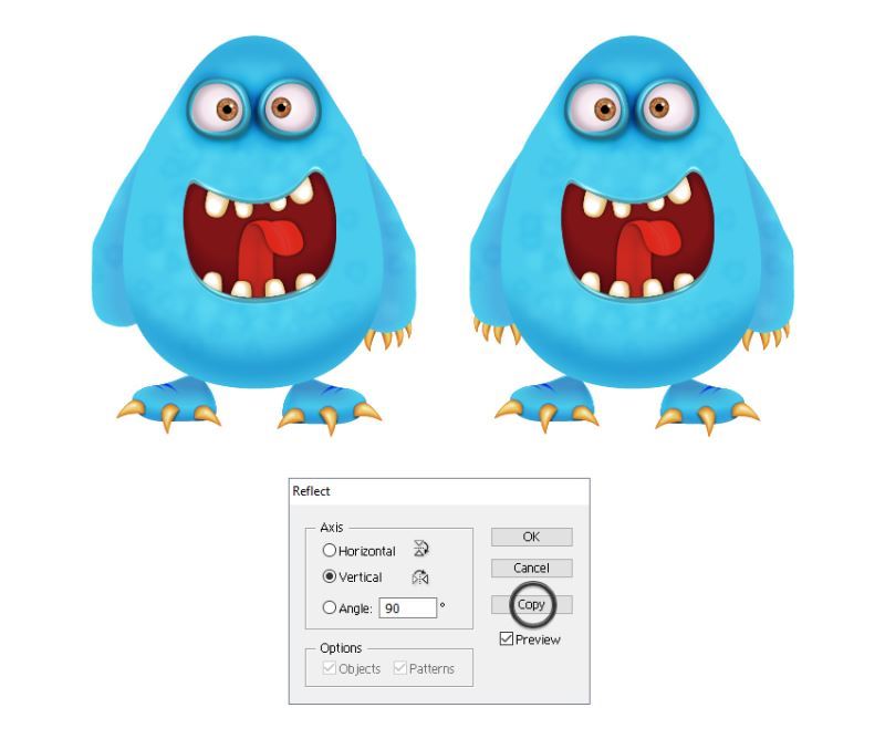 在右脚保持选定状态时,转到对象>变换>反射。选择垂直并点击复制以获得左脚。你所要做的就是将其移动到位,并在需要时进行小幅调整。