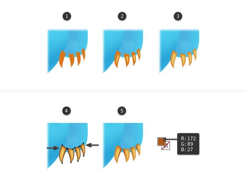 从混合组中只选择较大的爪形,然后复制并粘贴到位(Shift-Control-V)以复制它们。将这些副本移动到"图层"面板中的爪子后面,并选择棕色作为填充颜色。使用直接选择工具(A)仅选择这些形状的顶部锚点(无尖端),并借助键盘上的箭头键(4)稍微向内移动它们。你可以看到下面的结果(5)。