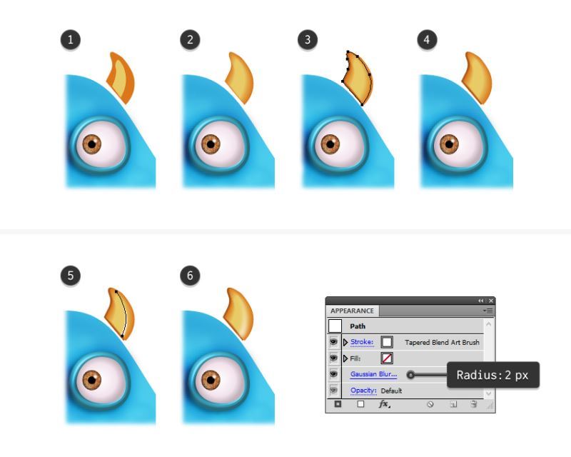 要添加一些亮点,请使用钢笔工具(P)在喇叭(5)上绘制一条路径。给它一个1磅白色笔画,并使用锥形混合艺术画笔。还应用2 px高斯模糊(6)。