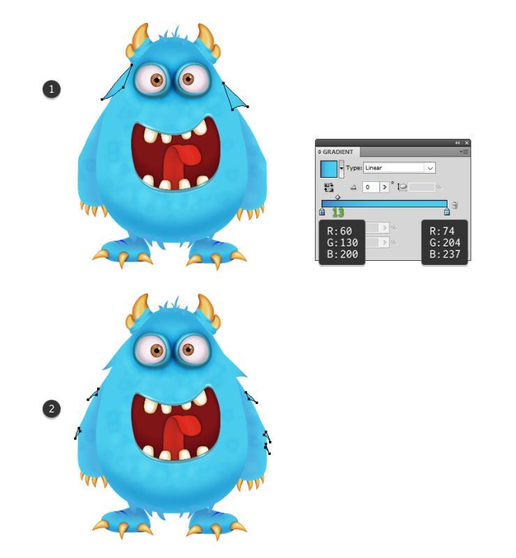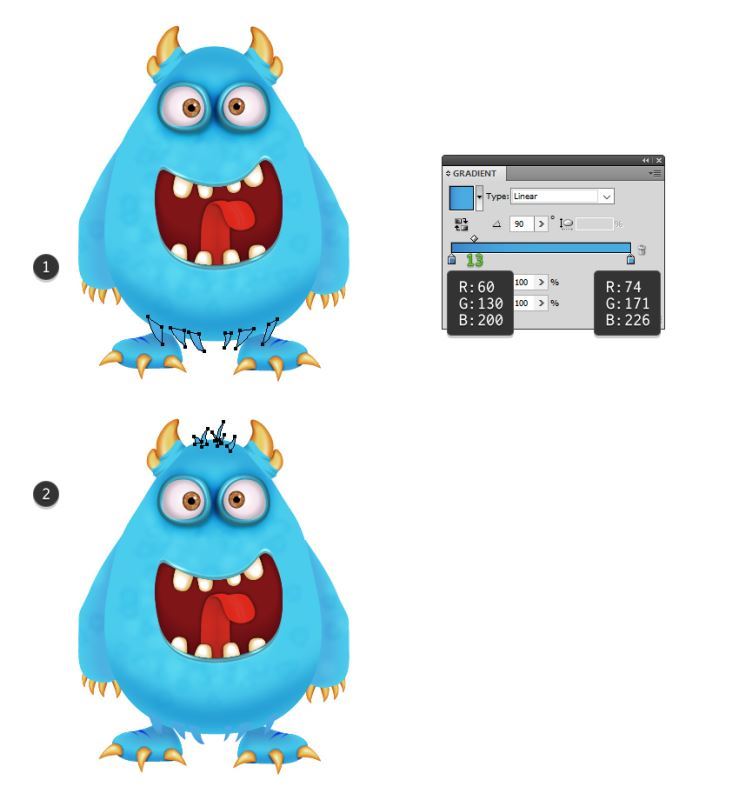 拿起钢笔工具(P),并在身体底部绘制几个三角形形状,填充以90度角(1)显示的线性渐变。继续头顶部的毛发片,并使用相同的渐变,但将角度改为-90度(2)。
