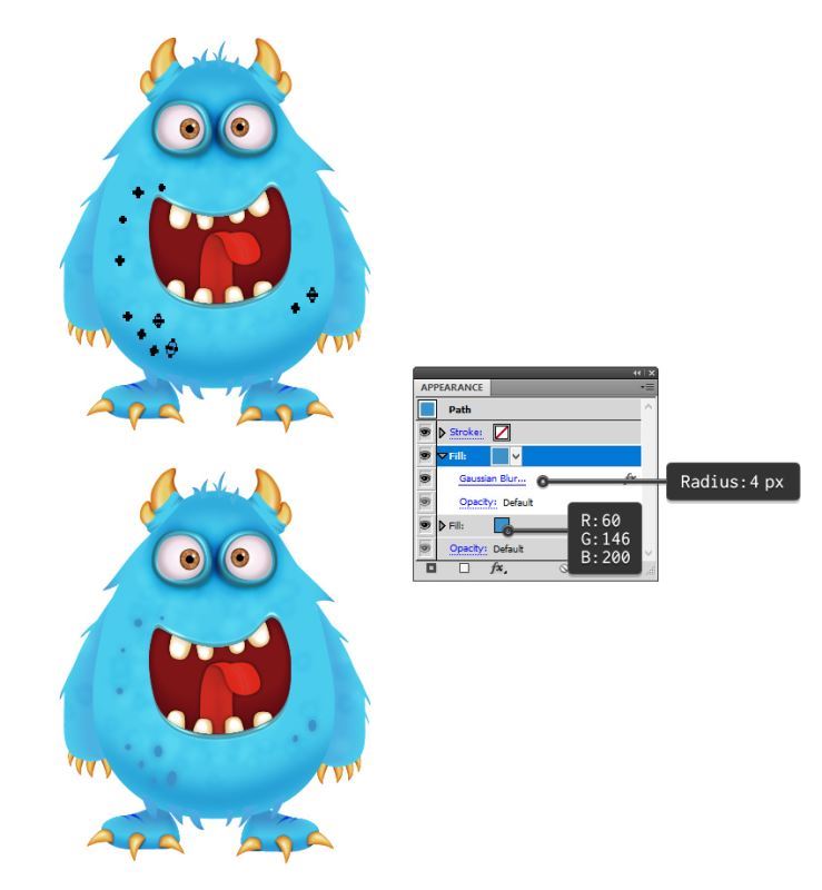 使用椭圆工具(L)在身体上绘制一组不同大小的椭圆。用蓝色填充它们。在上面添加一个新的填充并使用相同的颜色;然后应用4 px高斯模糊。