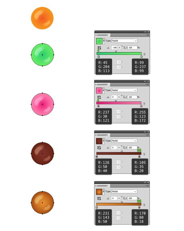 橙色糖果已准备就绪,您可以将Group(Control-G)所有形状组合在一起。制作小组的副本;然后只选择圆形并用所示的绿色径向渐变替换橙色渐变。